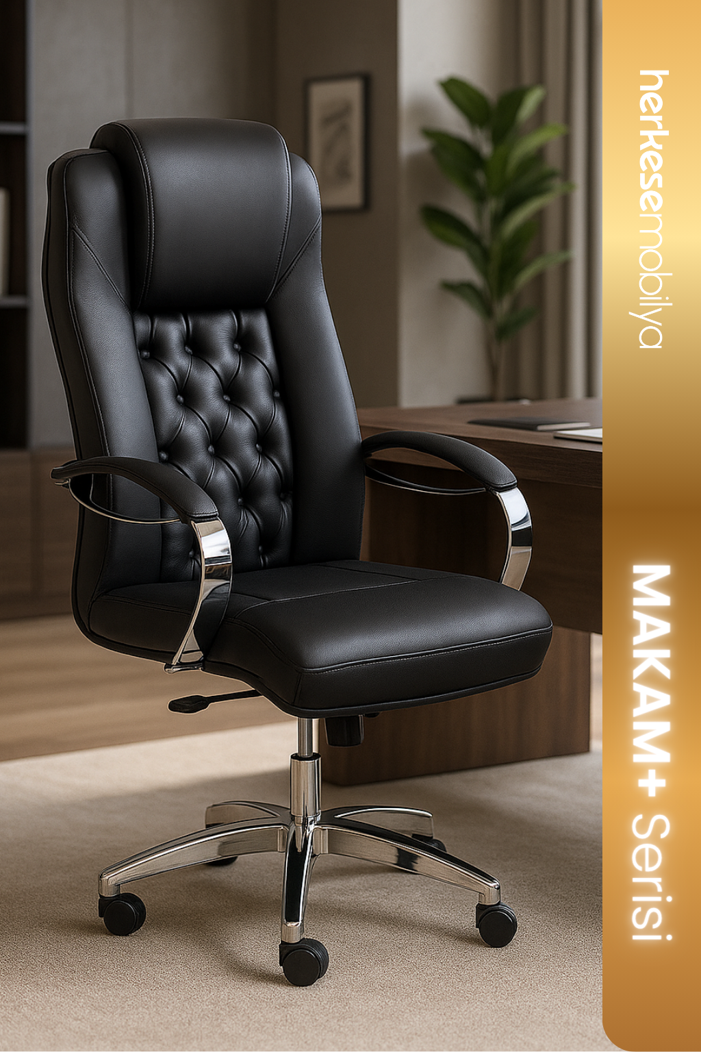 Burea Siyah Deri Makam Koltuğu, klasik şıklığı ve ergonomik konforu bir araya getirerek ofisinizde otoriter bir duruş sergiler. Makam odaları ve toplantı alanları için ideal tercihtir.
