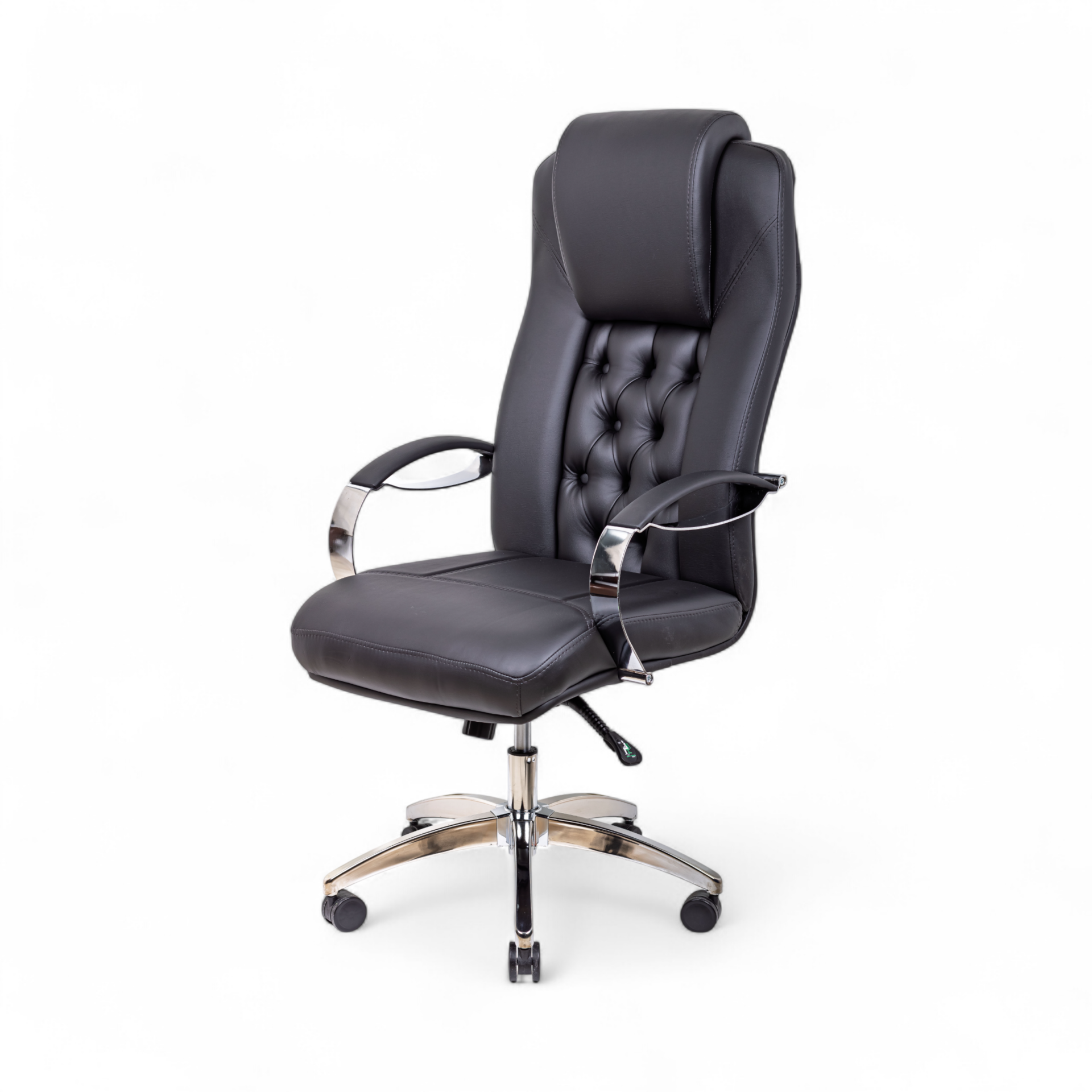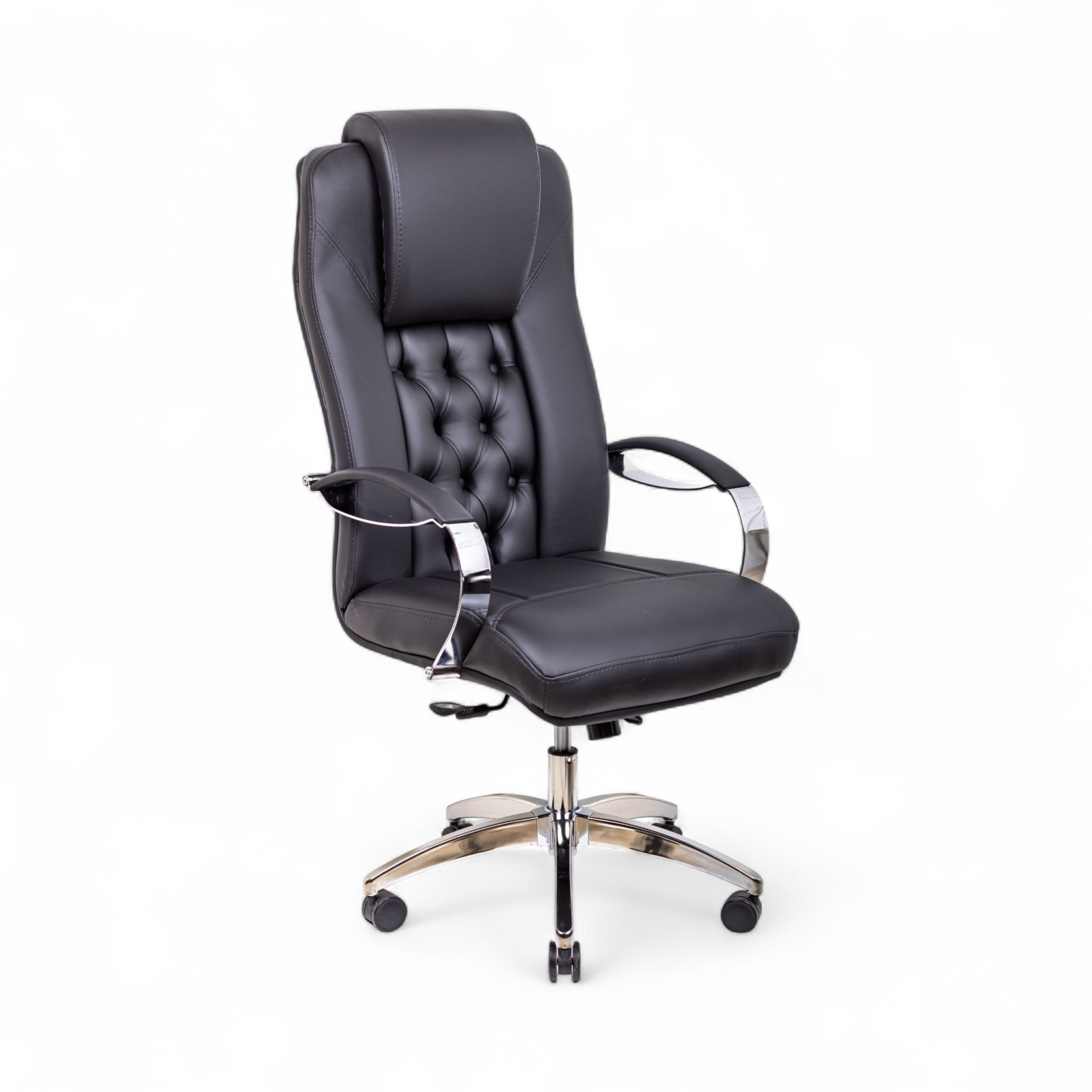 Burea Makam Koltuğu, zarif kapitone detayları ve siyah deri kaplamasıyla yönetici ofislerine klasik bir prestij katar. Yüksek sırt formu, dolgulu başlık bölgesi ve kavisli krom kolçakları sayesinde hem estetik hem de konforlu bir kullanım sunar.