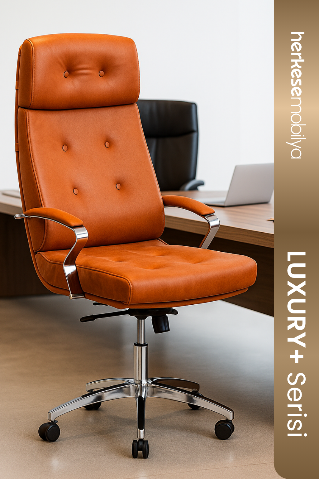 Enorm Makam Koltuğu, modern ve klasik tasarım çizgilerini bir arada sunarak makam odalarına zarafet ve prestij kazandırır. Kahverengi süet deri kaplaması, yumuşak dokusu ve düğmeli detaylarıyla dikkat çeken bu model, üst düzey yöneticiler için özel olarak tasarlanmıştır.